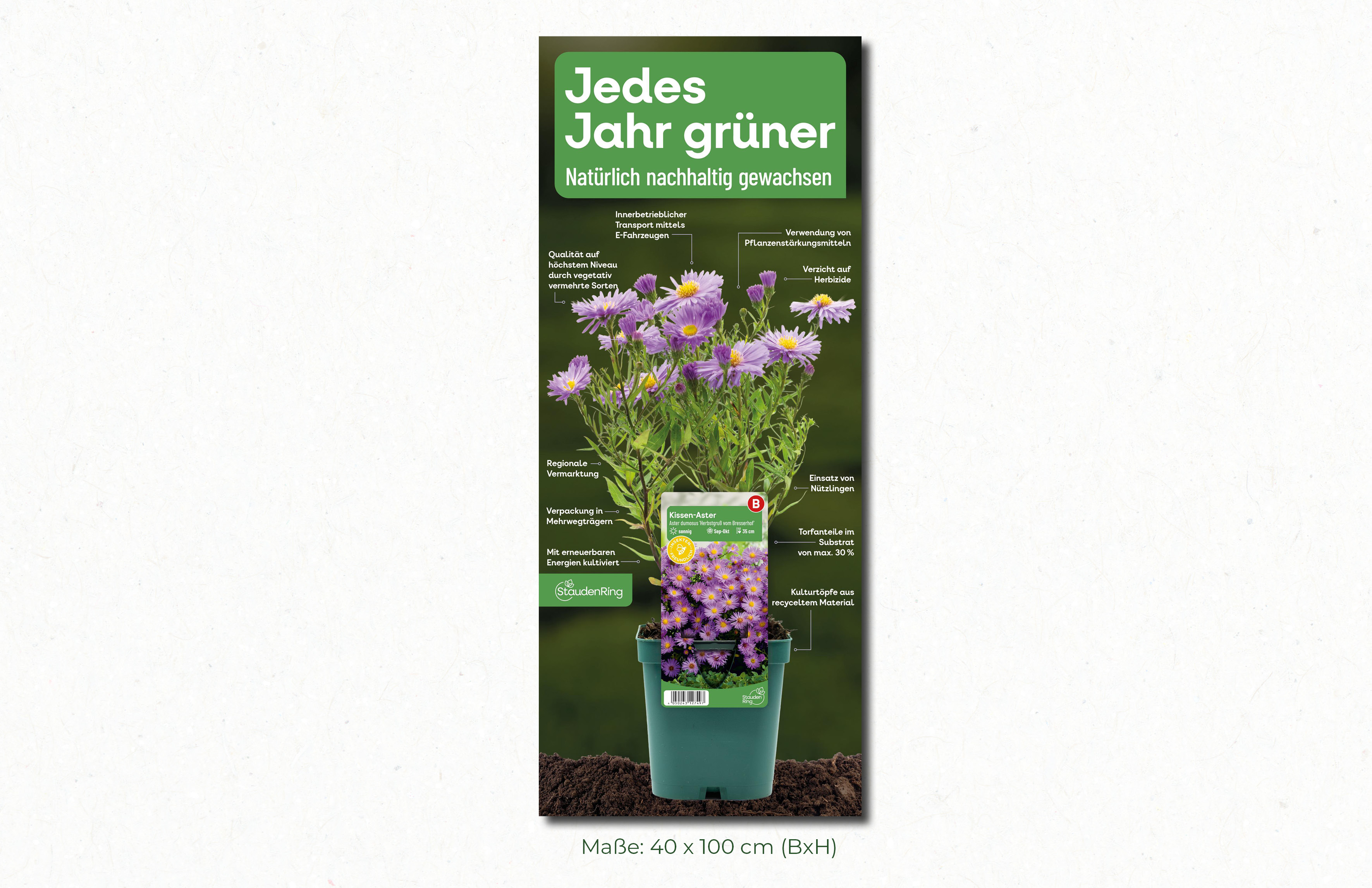Unter dem Motto „Jedes Jahr grüner“ verfolgen die Stauden Ring-Partnerbetriebe das Ziel, ihre Staudenproduktion zukunftsfähig und nachhaltiger zu gestalten. Gemeinsam werden Ideen und Erfahrungen ausgetauscht, um sich gegenseitig zur Umsetzung zu motivieren. Mit dem Tischaufsteller können Sie Ihre Kundinnen und Kunden am POS über dieses Engagement informieren.