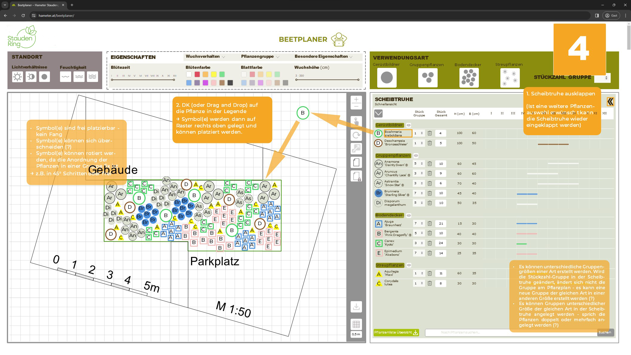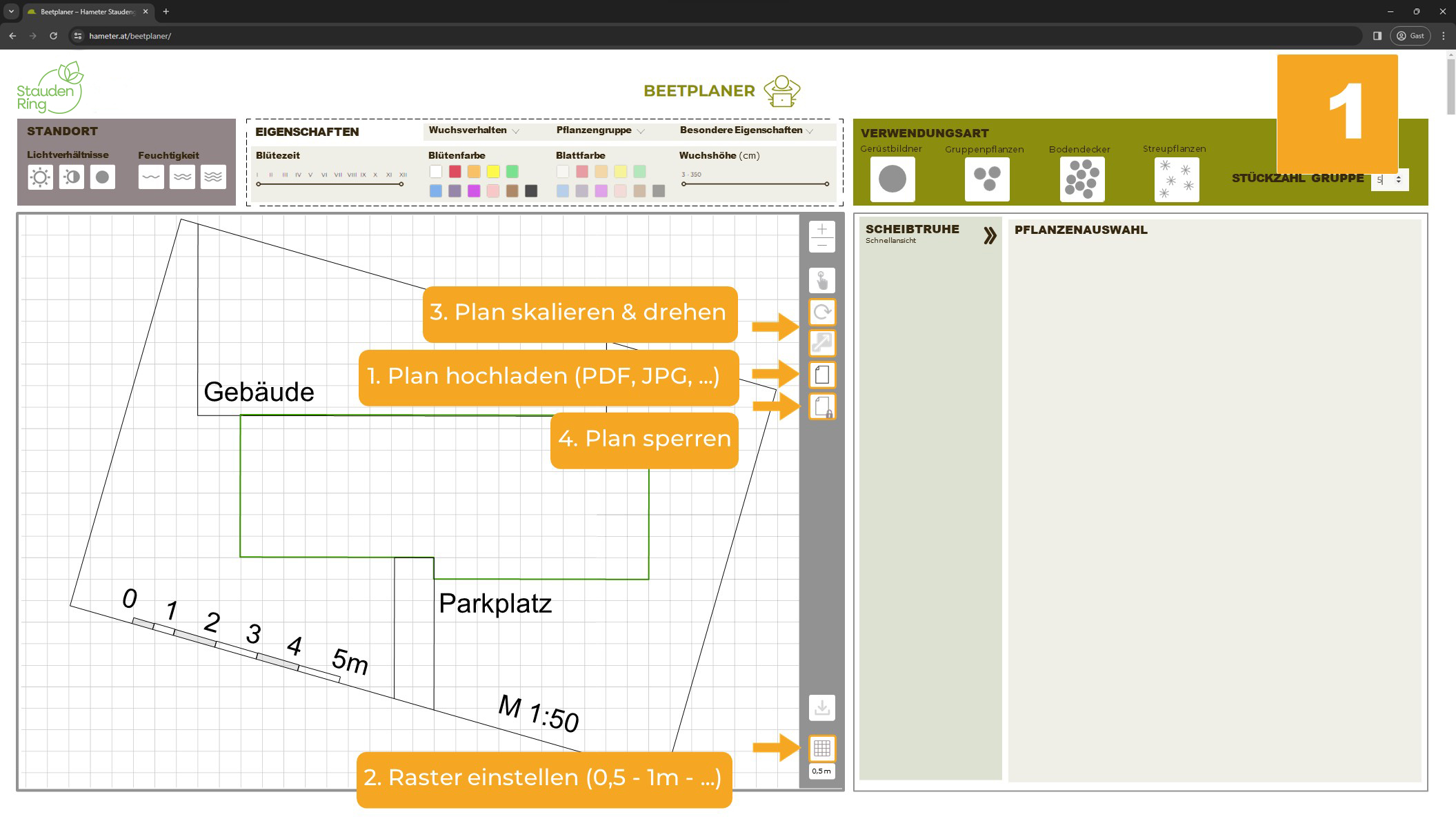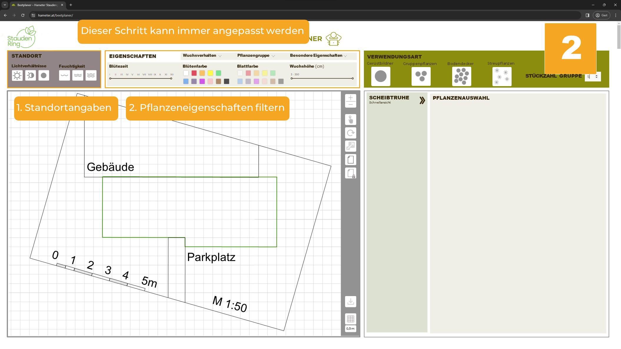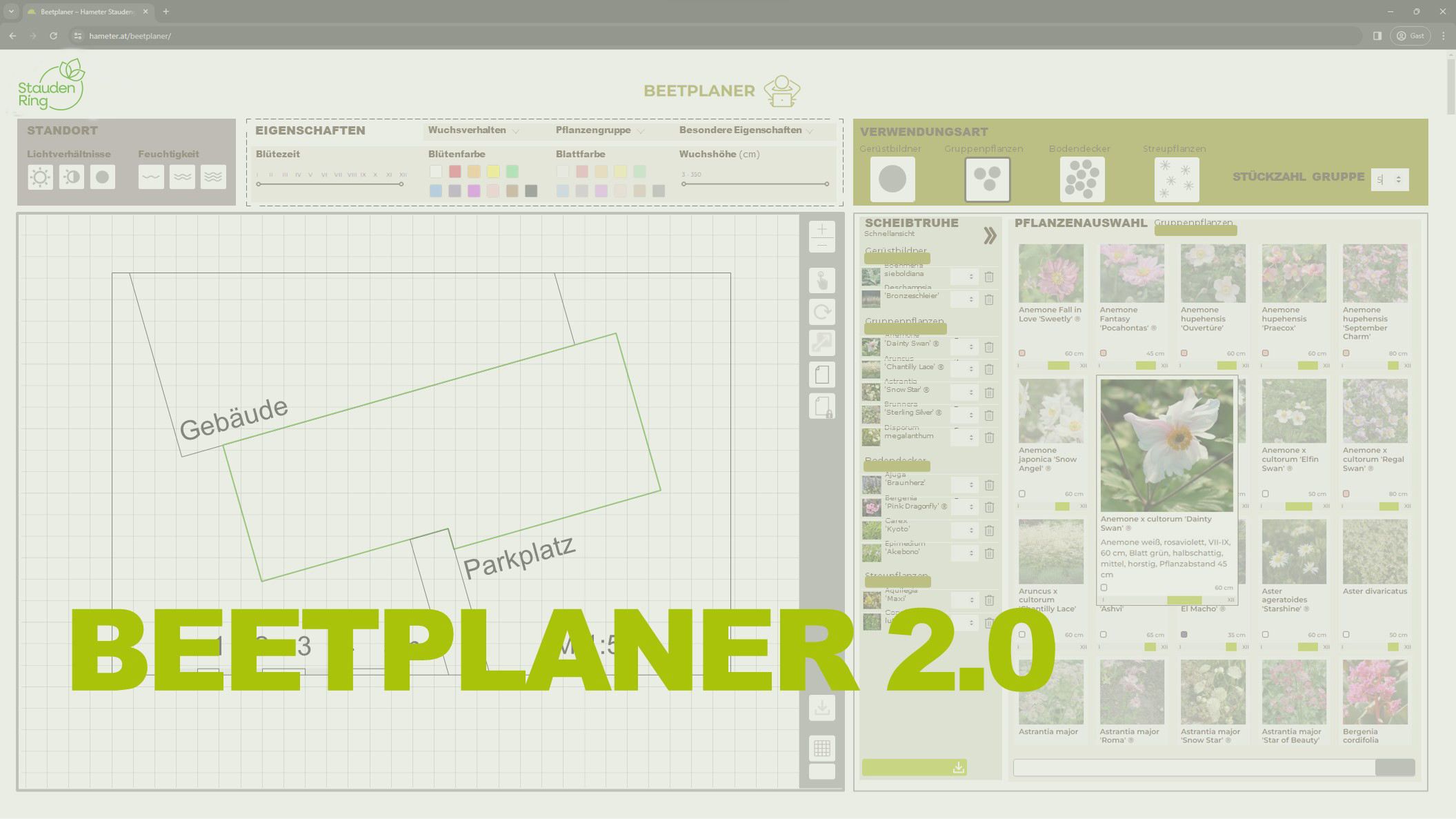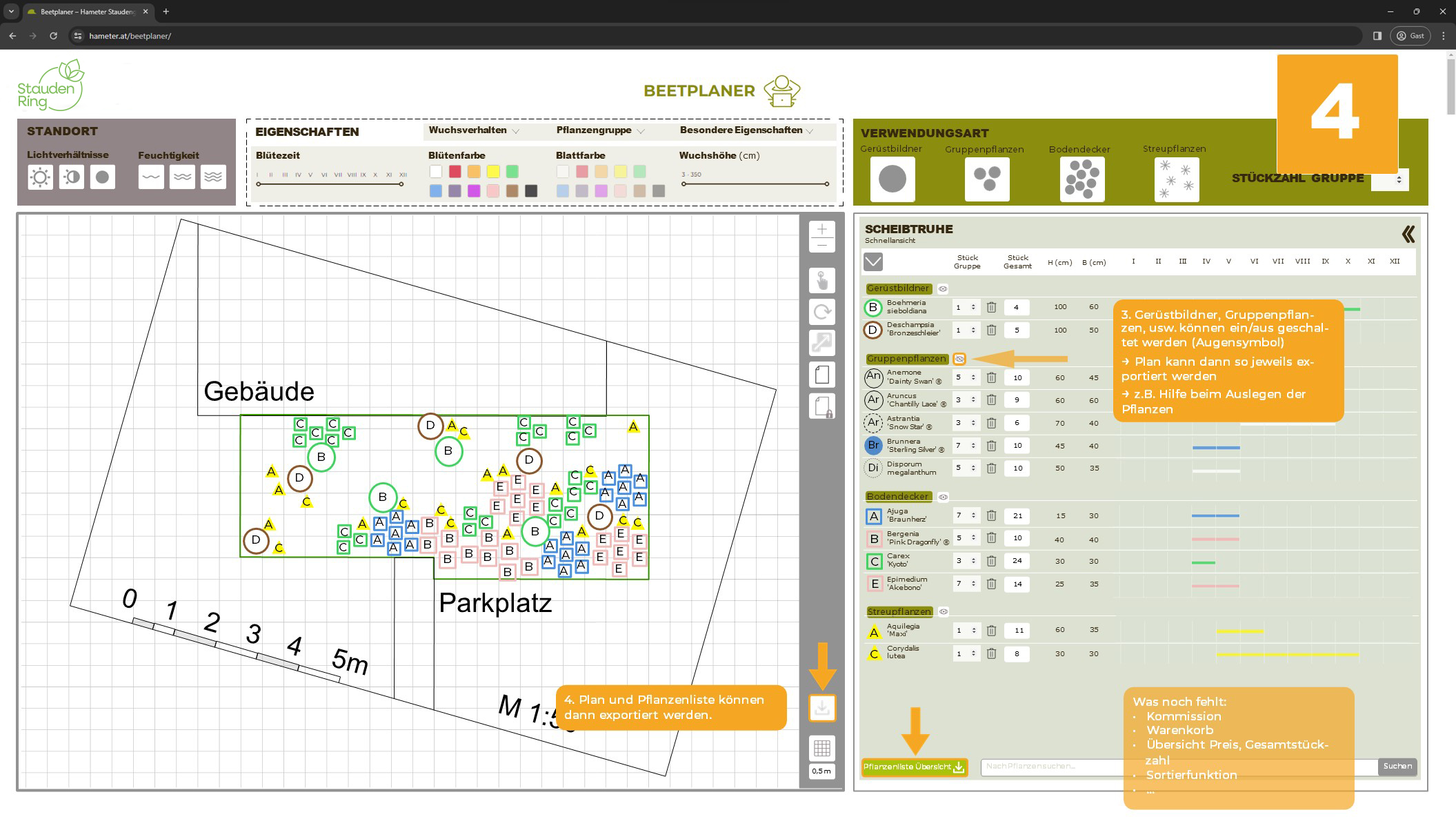 Mit im Gepäck hat der Stauden Ring wieder den Beetplaner, der mit einigen Neuheiten aufwarten kann. Das praktische Planungstool zeigt mit wenigen Klicks eine Auswahl der Gräser und Blütenstauden, die sich für einen bestimmten Standort eignen - Blühkalender und Auslegeplan inklusive. In der aktualisierten Version lässt sich nun auch ein Grundstücksplan hochladen, in den die Pflanzen direkt eingefügt werden können. Da der Beetplaner mit dem Webshop des ausgewählten Stauden Ring Partnerbetriebs verknüpft ist, können die Pflanzen ganz einfach direkt bestellt werden. Anschließend lässt sich der Plan als pdf-Dokument exportieren.