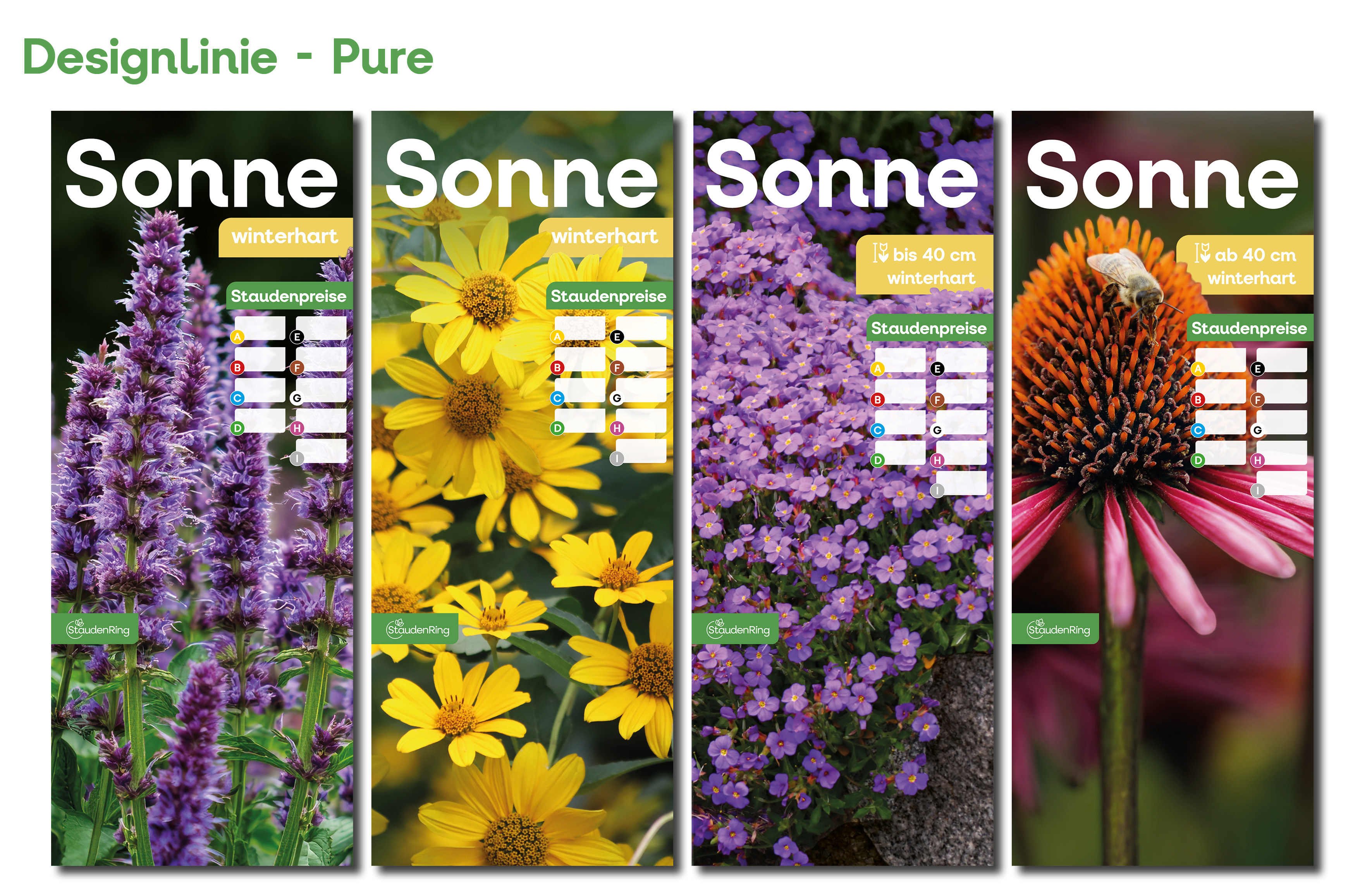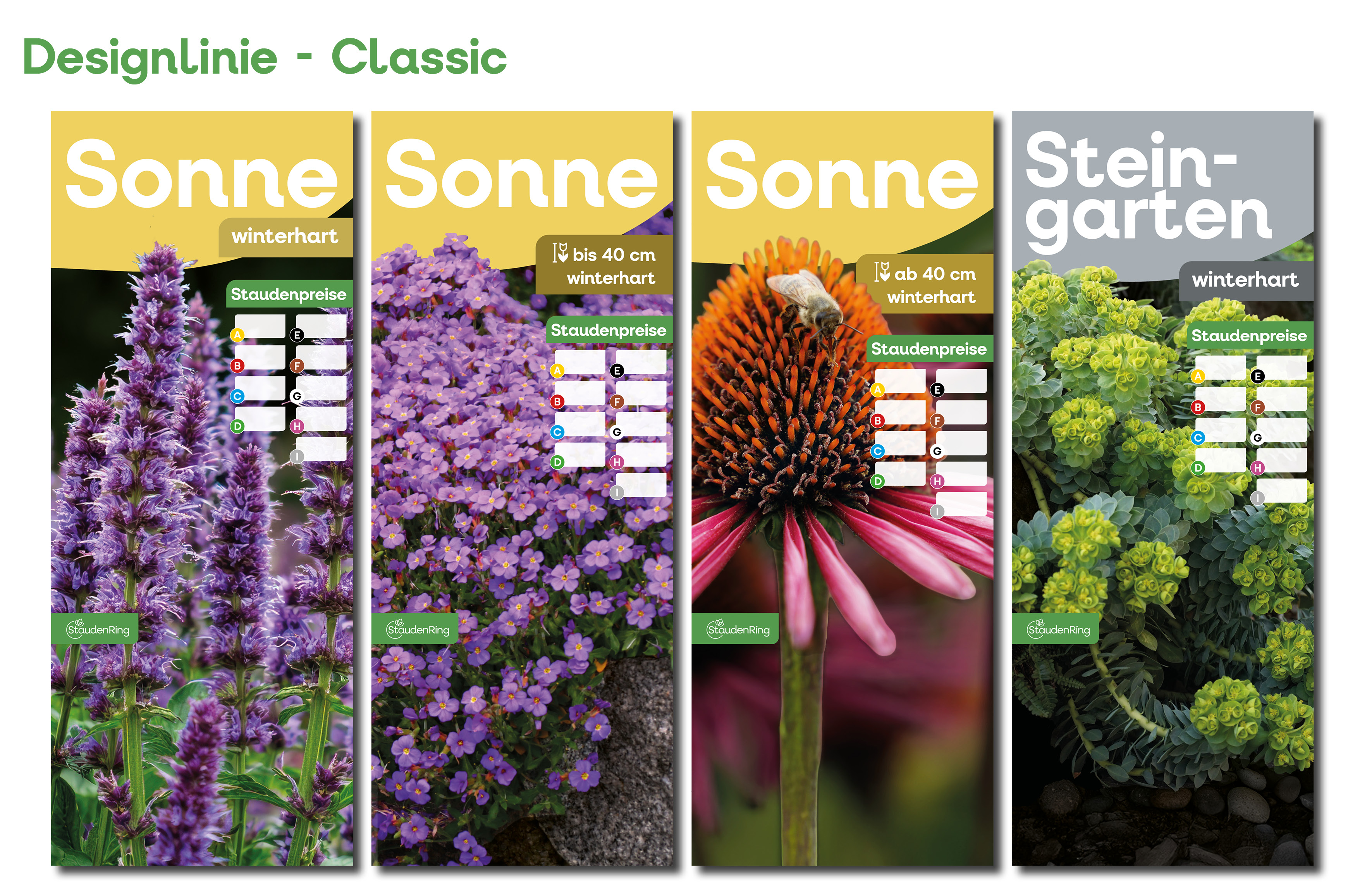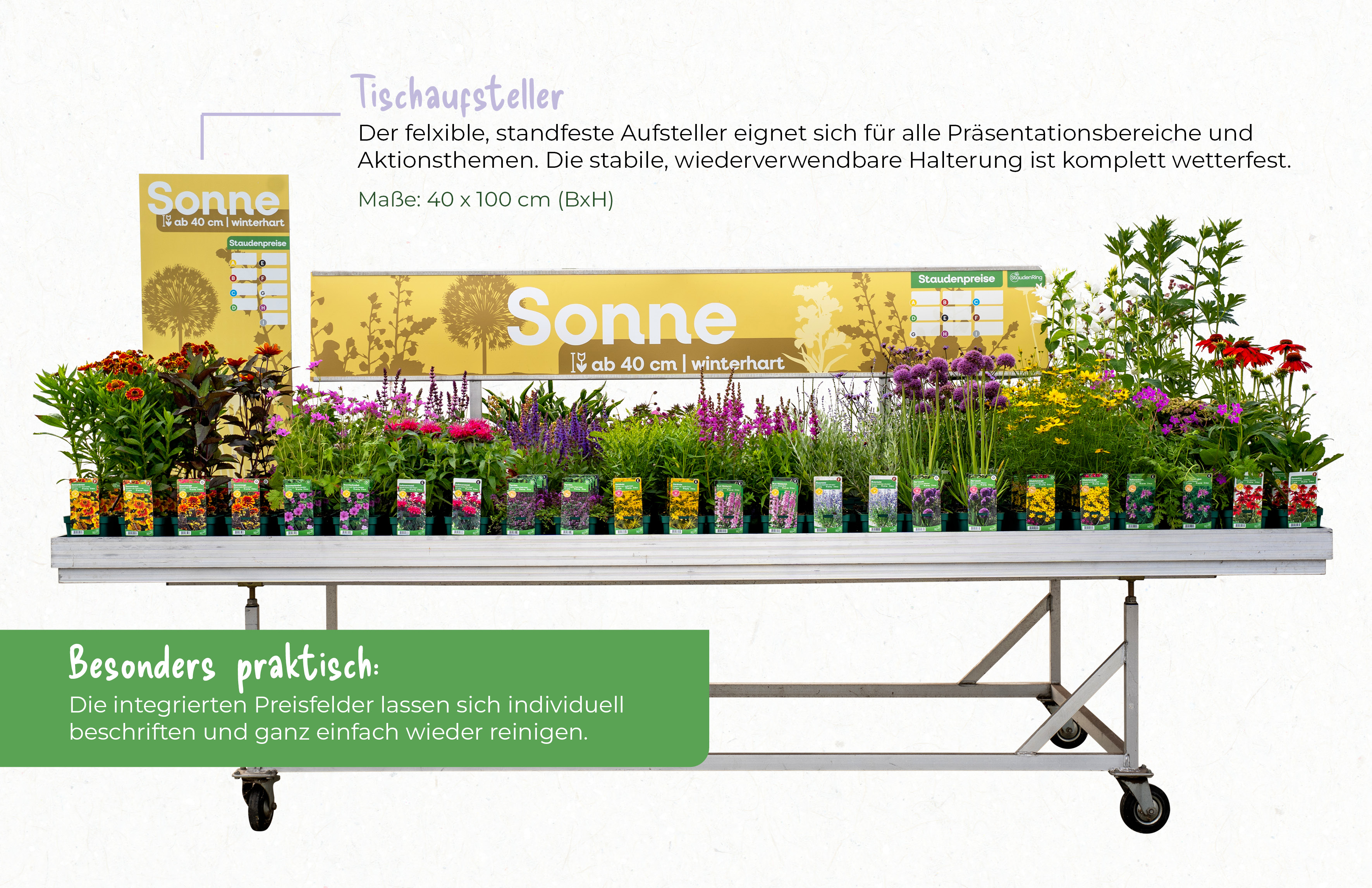 Ab dem Frühjahr 2026 gibt es passend zu den neuen Etiketten auch die Tischbanner in drei verschiedenen Designs. Derzeit befinden wir uns noch in der Umstellungsphase – daher sind auch die bisherigen Verkaufshilfen weiterhin erhältlich. Bitte erkundigen Sie sich bei Ihrem Stauden Ring-Partnerbetrieb nach der aktuellen Verfügbarkeit.